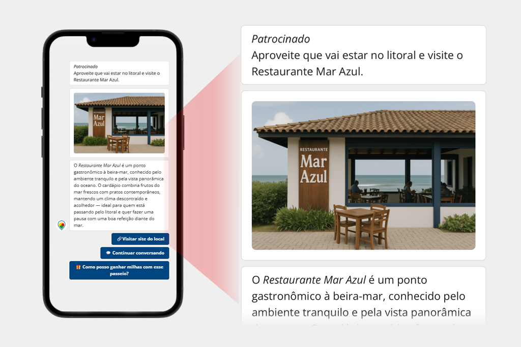Sua marca pode aparecer de forma integrada ao diálogo com o usuário, dentro da experiência do nosso guia inteligente. Um tipo de anúncio orgânico, mas com destaque garantido, sugerido sempre que houver afinidade com o interesse do visitante.